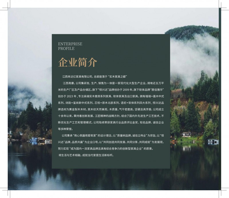 江西來達億家具有限公司,總部座落于“實木家具之都”江西南康,公司集研發、生產、銷售為一體是一家現代化大型生產企業,擁有近五萬平米的生產廠區及產品倉儲區。旗下“恒興達”品牌創辦于 2009 年,旗下軟體品牌“居佳雅華”創辦于2023年,專注高端實木套房系列家具、軟體家具及出口家具,擁有禧瑞·嘉木中式系列、詩韻·璽尚新中式系列、芯悅·原木北歐系列、語初·軟體系列四大系列 , 恒興達品牌選材為黃金梨木木材,其木紋天然美觀,木質重,氣干密度高,堅硬且具芳香,公司成立十余年以來,秉持著創新發展、工匠精神的戰略方針,結合了國內外先進生產工藝技術,不斷優化生產工藝和管理模式,公司陸續榮獲家具行業品質評比金獎、知名品牌、誠信企業等多種榮譽。