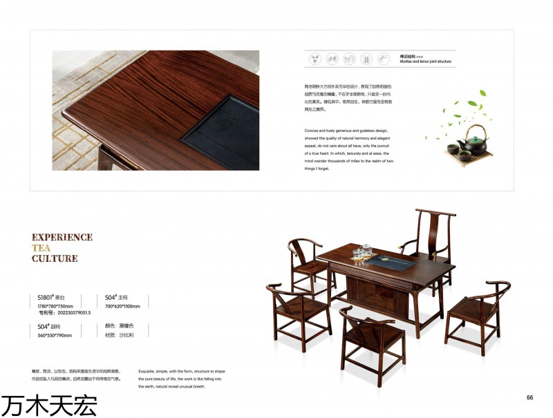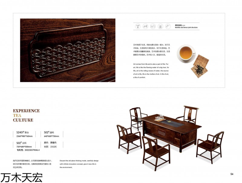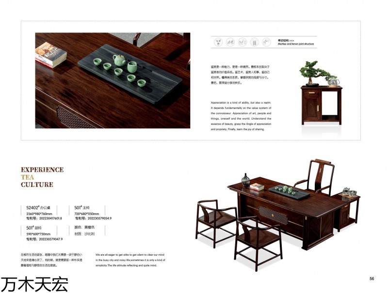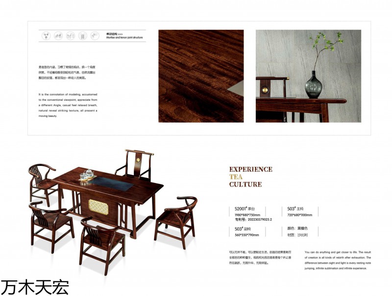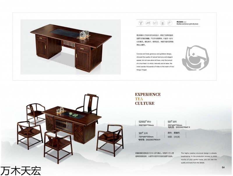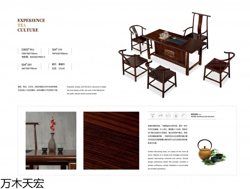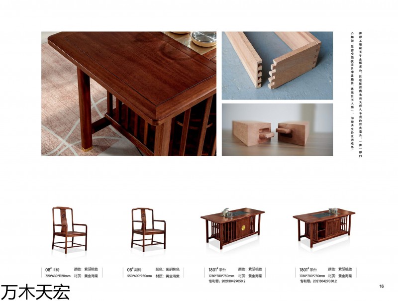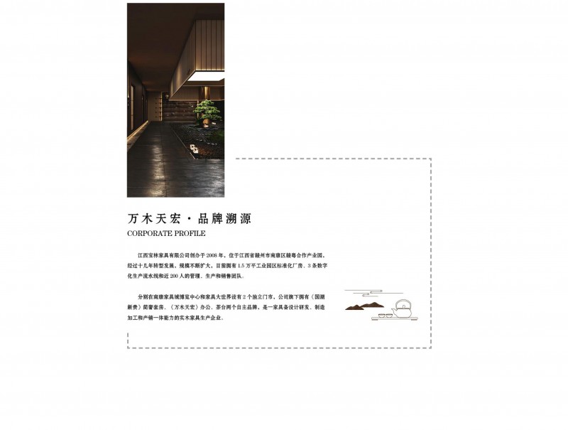 分別在南康家具城博覽中心和家具大世界設有2個獨立門市,公司旗下擁有《國潮新貴》簡奢套房、《萬木天宏》辦公、茶臺兩個自主品牌,是一家具備設計研發、制造加工和產銷一體能力的實木家具生產企業。