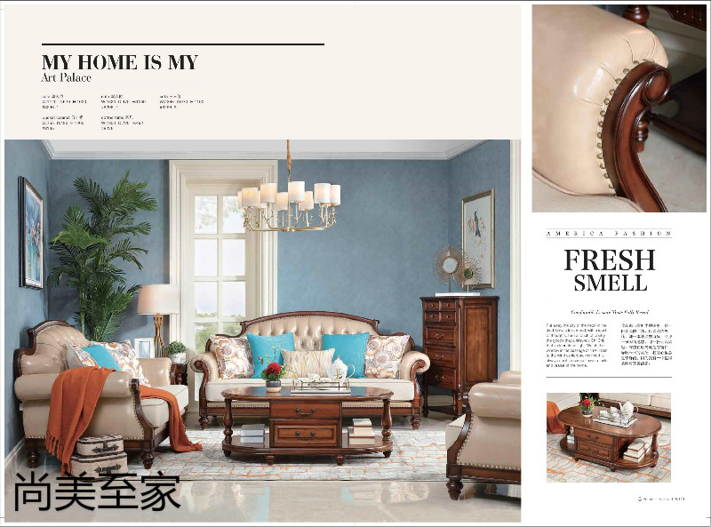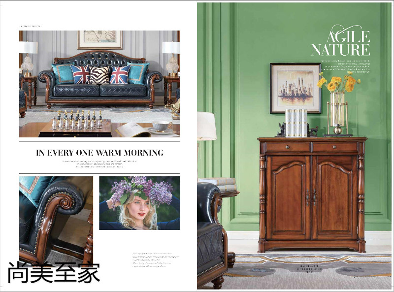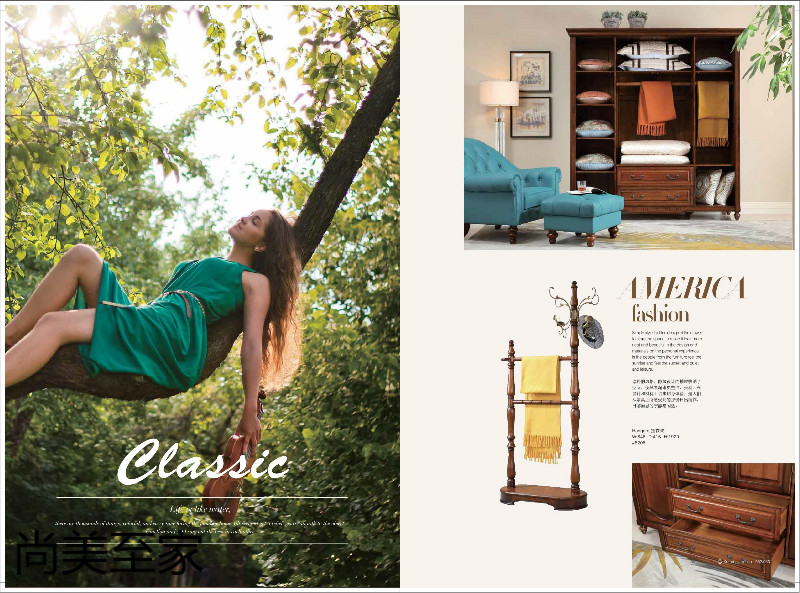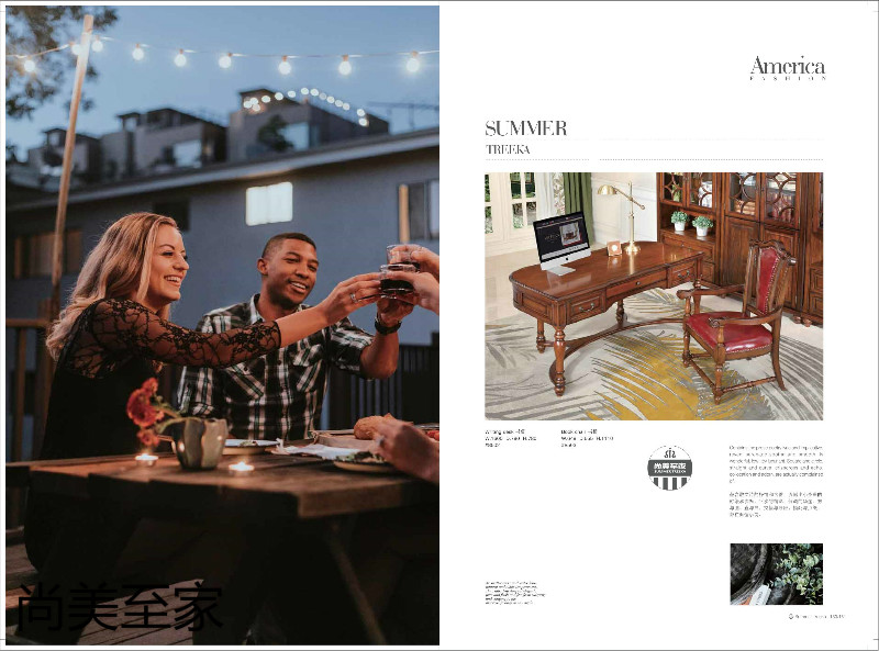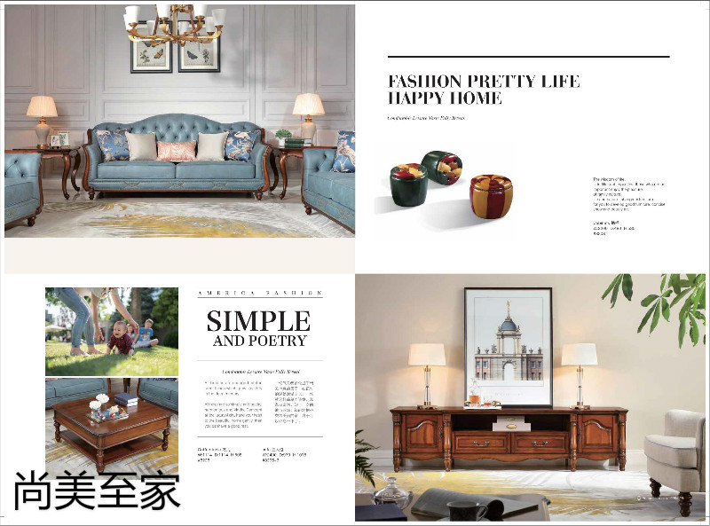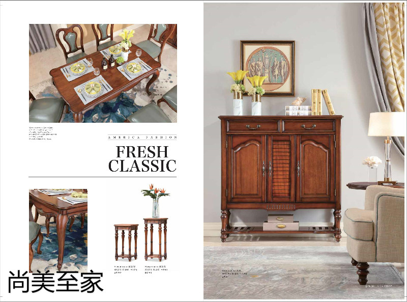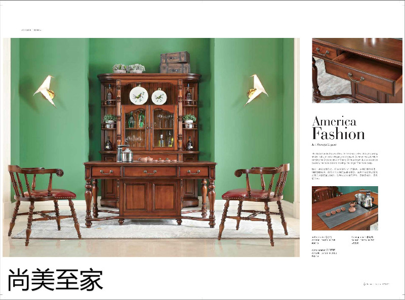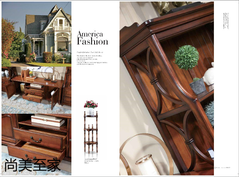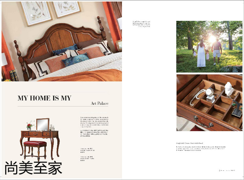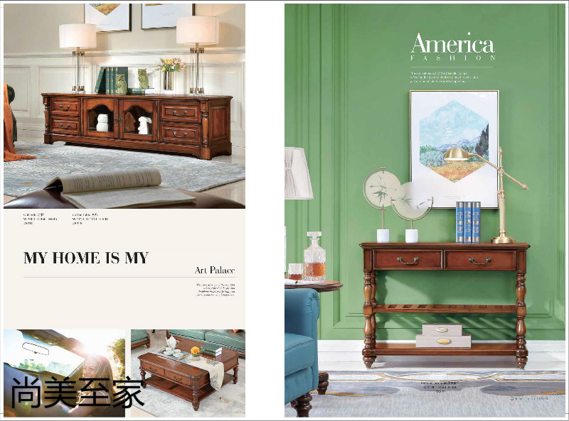 公司產品線以現代美式和簡約美式為主,現有國內實木品牌“尚美至家”系列,涵蓋:臥房、客廳、餐廳、書房、起居室等空間家用產品。年產能上億,既滿足了常規家庭需求,又給一些高端群體提供了個性化的服務。尚美至家系列的產品均采用套框工藝制作,材質方面使用的是非洲進口桃花芯材質。噴涂方面采用的是阿克蘇油漆涂裝。其色彩溫煦典雅。尚美至家融合了美式家具的簡約元素。