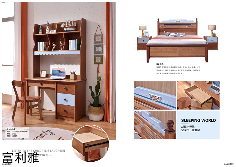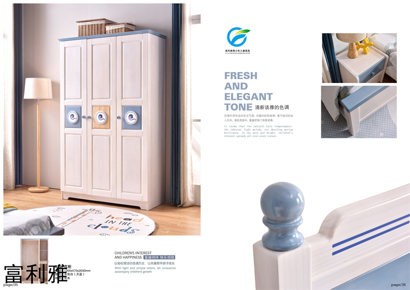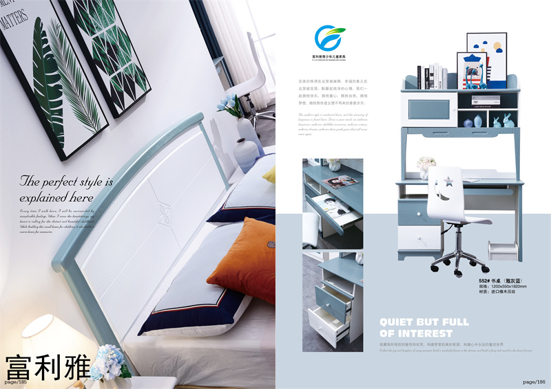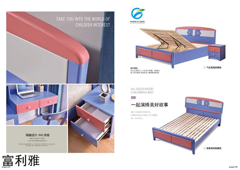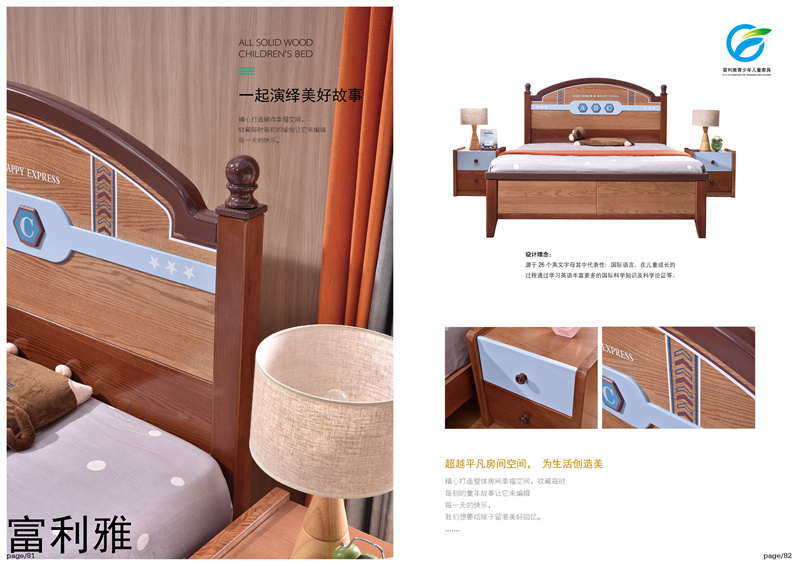 目前富利雅家具擁有多個系列的青少年兒童套房家具產品,公司生產的青少年兒童家具注重安全環保和時尚色彩,每一款家具設計充分考慮青少年兒童成長特點和生活習慣,精選優質實木,突出個性化色彩,打破傳統的設計風格,顯示出無盡的青春活力;打造出綠色環保、安全又讓孩子們喜歡的家具。