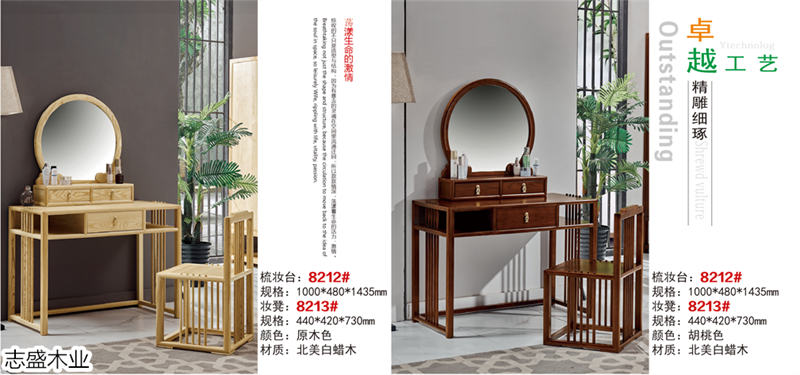 產品以進口美國白臘木為主材料,生產新中式家具和禪意系列家具,這十幾年來,公司先后與福建廈門、廣東樂從及蘇州蠡口等全國各地的家具業商家強強聯手,信息共享、技術共享,開放與包容的經營策略,使得志盛公司產品無論在外型美觀度,還是在產品實用性上都有質的飛越,產品也更環保。
