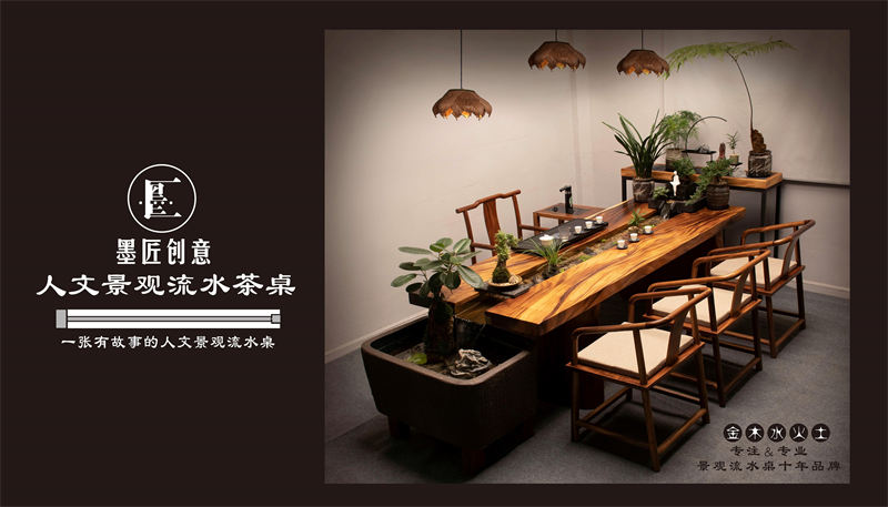 隨著消費升級和文化推進,一張普通的茶桌已經無法滿足消費者的生活需求,在浮躁且快節奏的生活中人們更需要一張擁有詩和遠方的景觀桌,一張有生命、有靈魂、有故事情懷的景觀流水桌來滿足其對生活品味的提升!