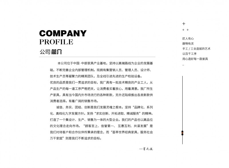 誠信、務(wù)實(shí)、團(tuán)結(jié)、創(chuàng)新是我們發(fā)展靈魂之根本。堅(jiān)持“品牌化、系列化、高檔化九字發(fā)展方針。發(fā)揚(yáng)“求實(shí)創(chuàng)新、開拓進(jìn)取、精誠服務(wù)”的精神。打造了一個(gè)集設(shè)計(jì)、生產(chǎn)、銷售為一體的大型企業(yè)。我們的產(chǎn)品也以高品位的文化理念走向市場(chǎng)。“顧客至上、信譽(yù)第一、互惠互利、共謀發(fā)展”是我們對(duì)待客戶和合作伙伴所秉承的理念,而“薈萃世界經(jīng)典家具,服務(wù)社會(huì)萬干家庭”則是我們不斷追求的目標(biāo)。