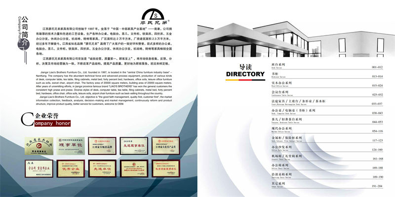 江西廖氏兄弟家具有限公司創始于1997年,坐落于“中國·中部家具產業基地”——南康。公司擁有雄厚的技術力量和先進的工藝設備,生產各種辦公桌、電腦臺、茶幾、文件柜、鐵架床、四折床、五金辦公沙發、休閑辦公沙發、機場椅、轉椅等家具。廠區面積達2萬平方米,廠房建筑面積2.3萬平方米。經過多年不懈奮斗,江西省知名品牌“廖氏兄弟”贏得了廣大客戶的一致好評和贊譽。款式多樣的辦公桌、電腦臺、茶幾、文件柜、鐵架床、四折床、五金辦公沙發、休閑辦公沙發、機場椅、轉椅等家具暢銷全國各地。