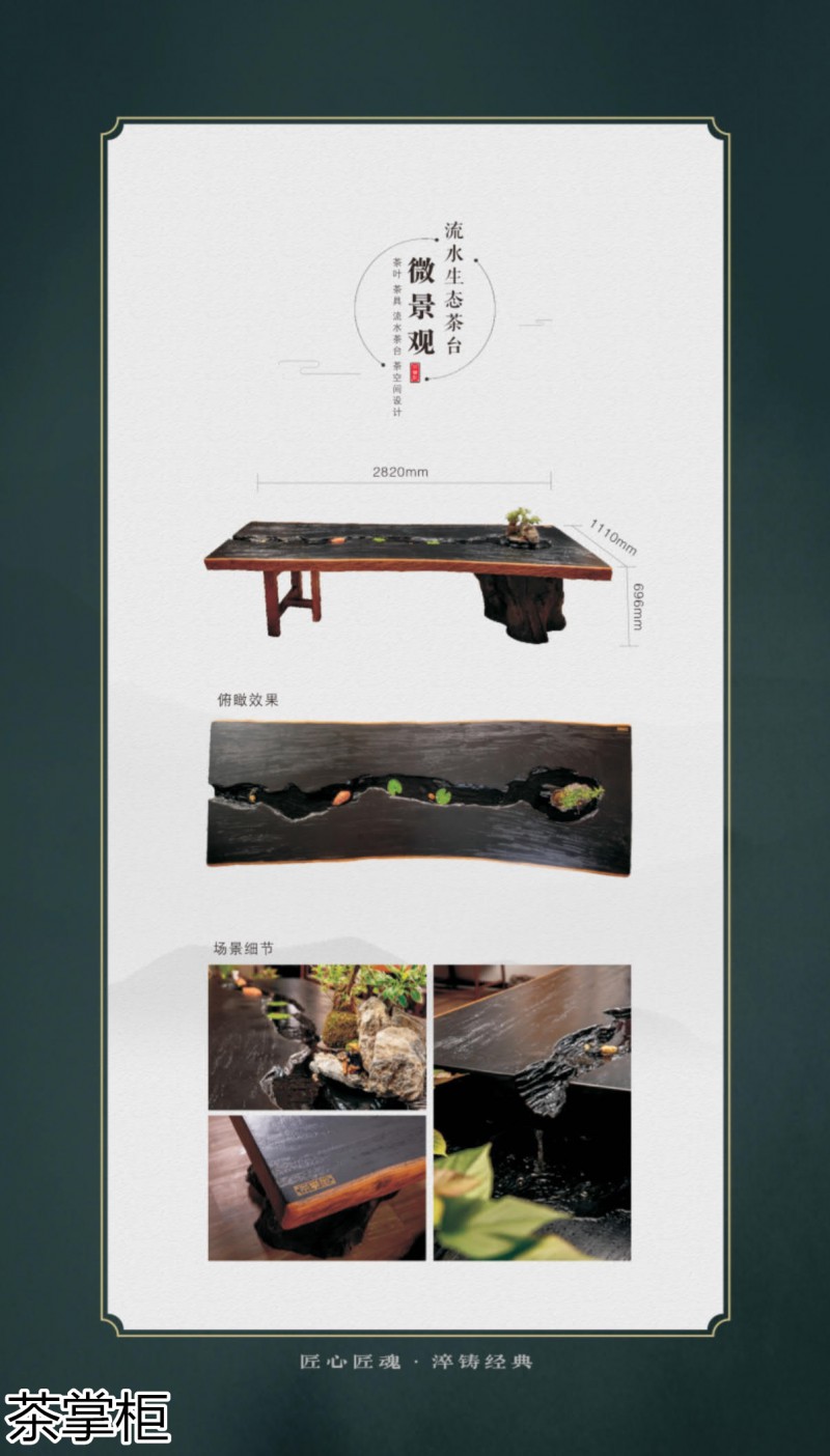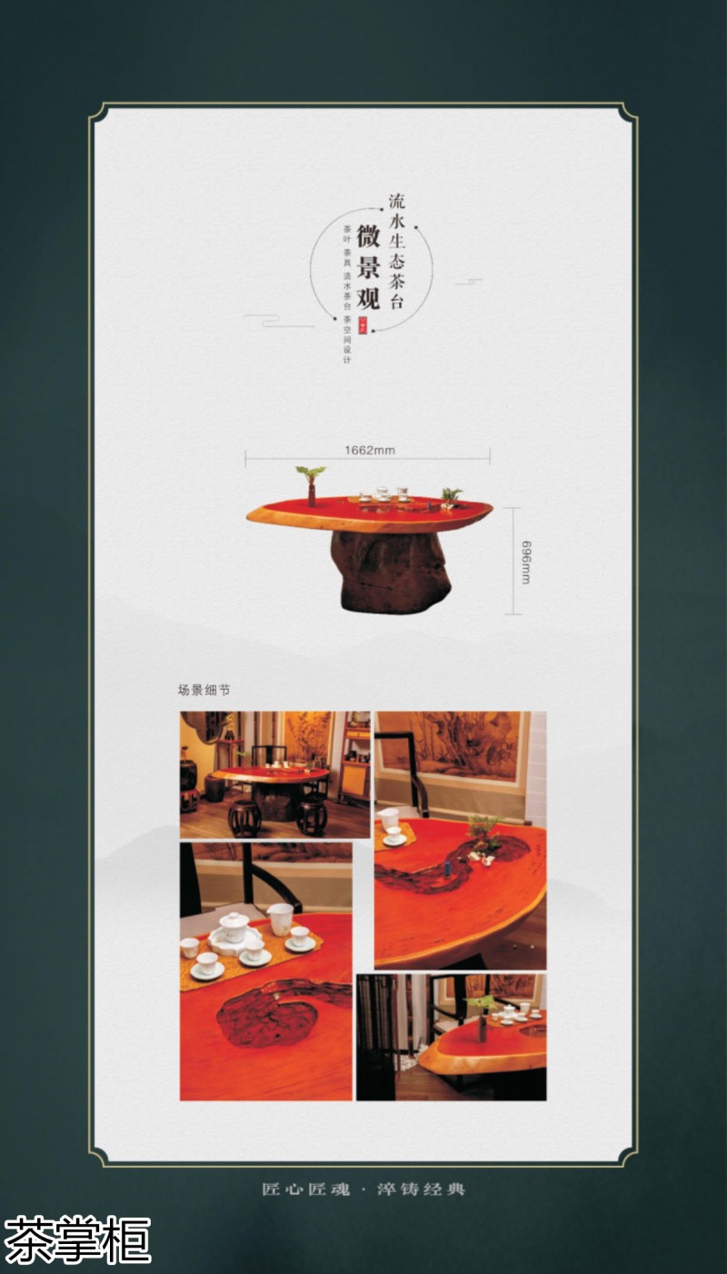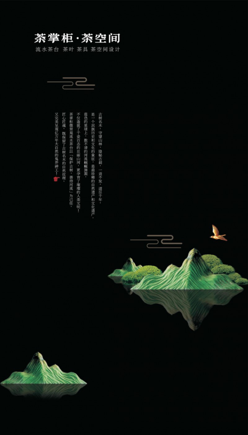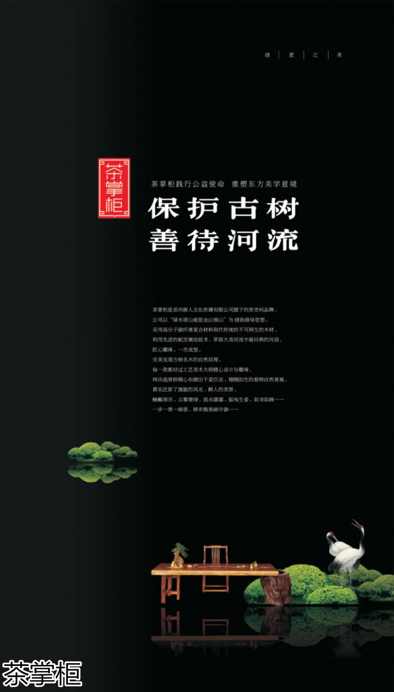 茶掌柜是鄭州唐人文化傳播有限公司旗下的茶空間品牌,公司以“綠水青山就是金山銀山”為創(chuàng)始指導(dǎo)思想,采用高分子碳纖維復(fù)合材料取代傳統(tǒng)的不可再生的木材,利用先進(jìn)的航空測繪技術(shù),萃取大美河流中經(jīng)典的河段,匠心雕琢,一次成型,完美呈現(xiàn)古樹名木的自然紋理,每一款都經(jīng)過工藝美術(shù)大師精心設(shè)計(jì)與雕琢,再由造景師精心布置出千姿百態(tài)、栩栩如生的獨(dú)特自然景觀,真實(shí)還原了旖旎的風(fēng)光,醉人的美景,蜿蜒綿亙、云霧繚繞、流水潺潺、搖曳生姿、如詩如畫...一步一景一畫卷,移步換景畫中游...