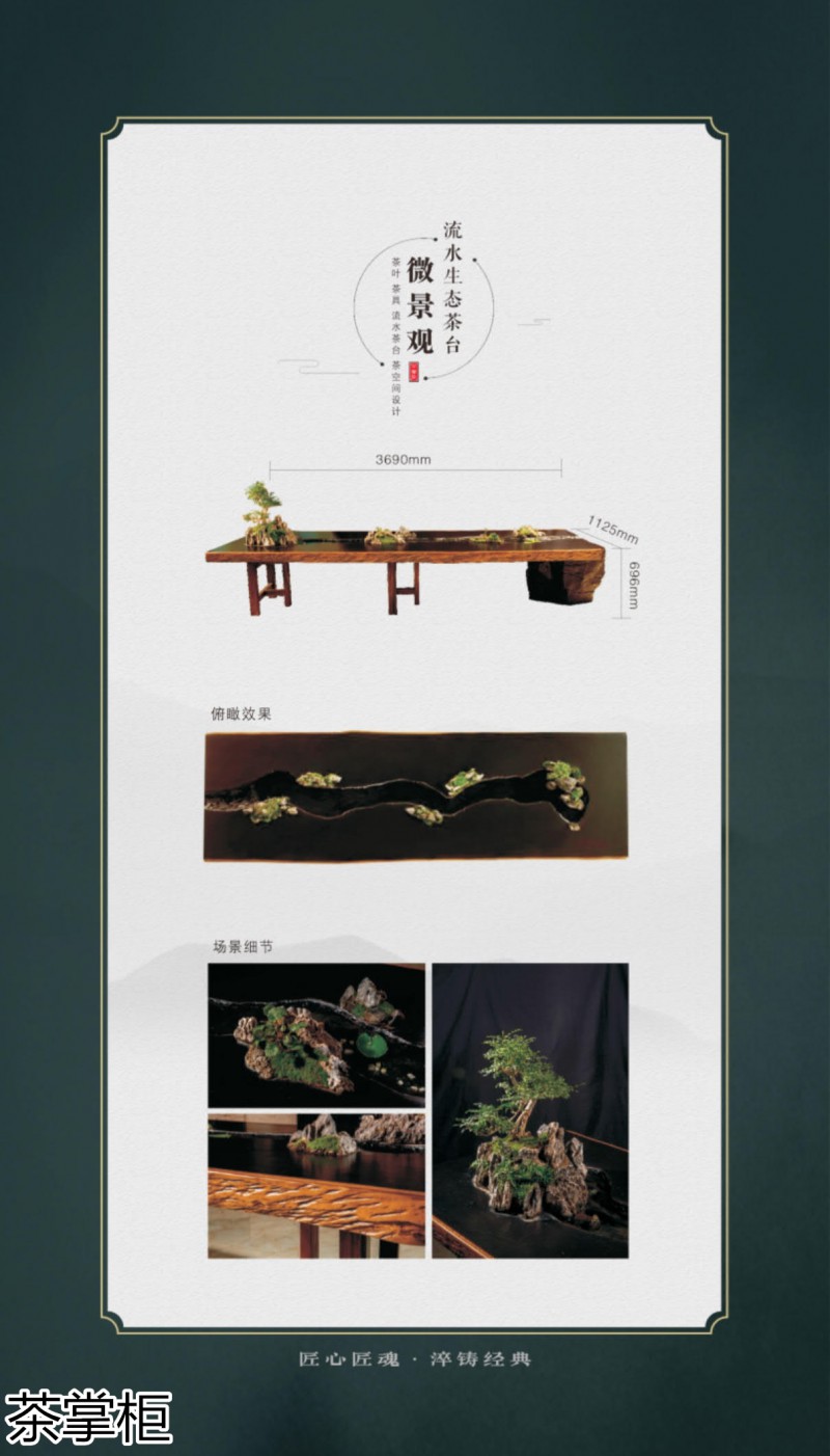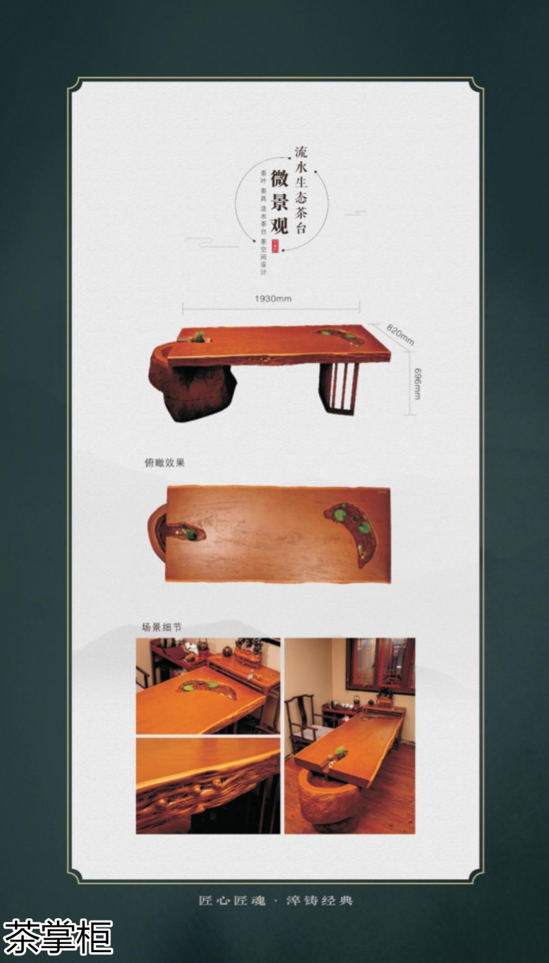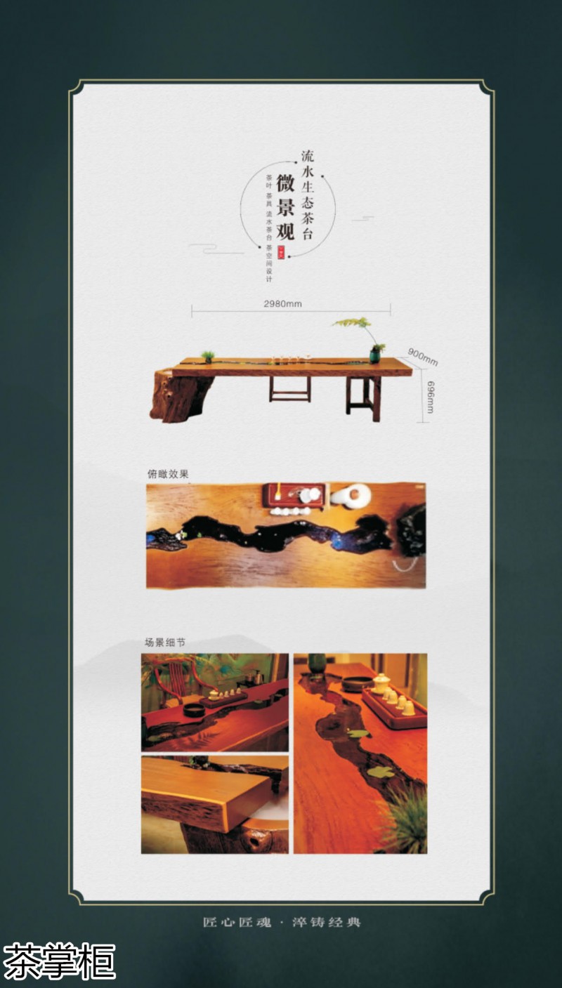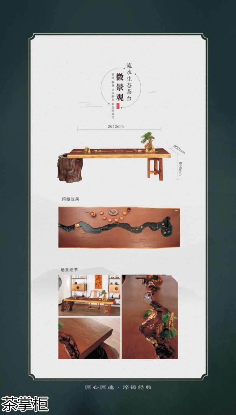 茶掌柜是鄭州唐人文化傳播有限公司旗下的茶空間品牌,公司以“綠水青山就是金山銀山”為創(chuàng)始指導(dǎo)思想,采用高分子碳纖維復(fù)合材料取代傳統(tǒng)的不可再生的木材,利用先進(jìn)的航空測繪技術(shù),萃取大美河流中經(jīng)典的河段,匠心雕琢,一次成型,完美呈現(xiàn)古樹名木的自然紋理,每一款都經(jīng)過工藝美術(shù)大師精心設(shè)計(jì)與雕琢,再由造景師精心布置出千姿百態(tài)、栩栩如生的獨(dú)特自然景觀,真實(shí)還原了旖旎的風(fēng)光,醉人的美景,蜿蜒綿亙、云霧繚繞、流水潺潺、搖曳生姿、如詩如畫...一步一景一畫卷,移步換景畫中游...