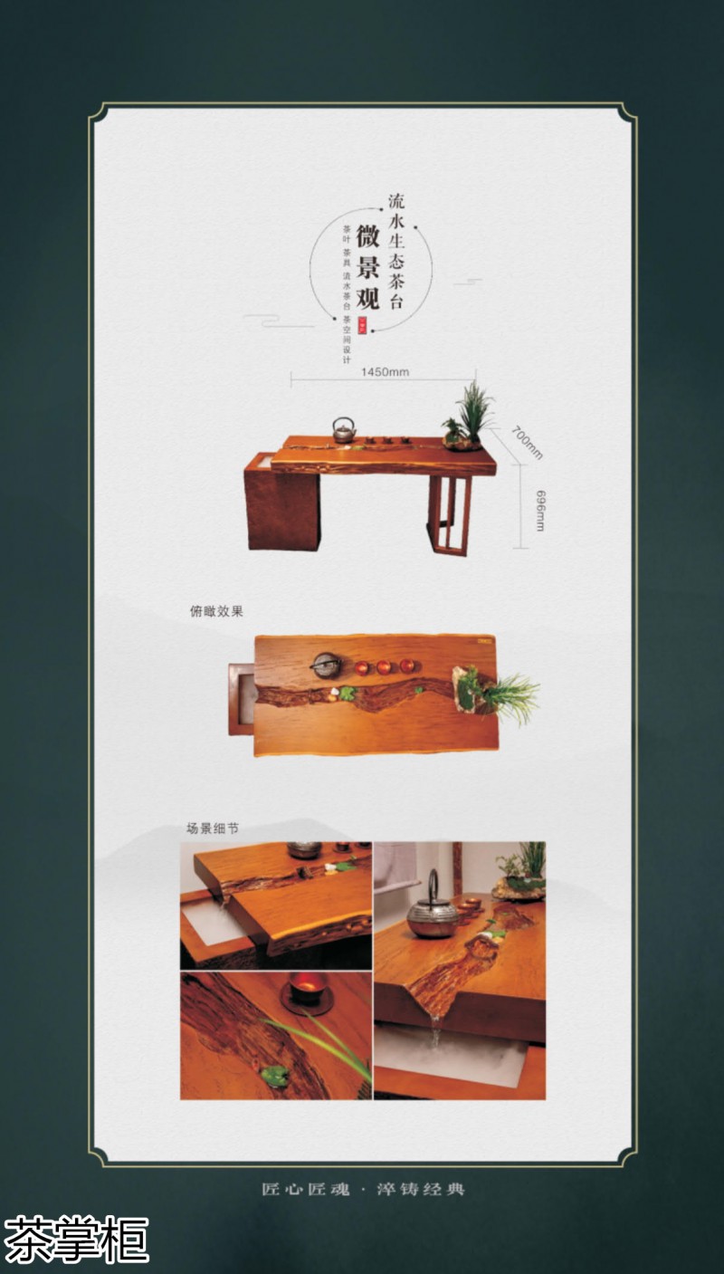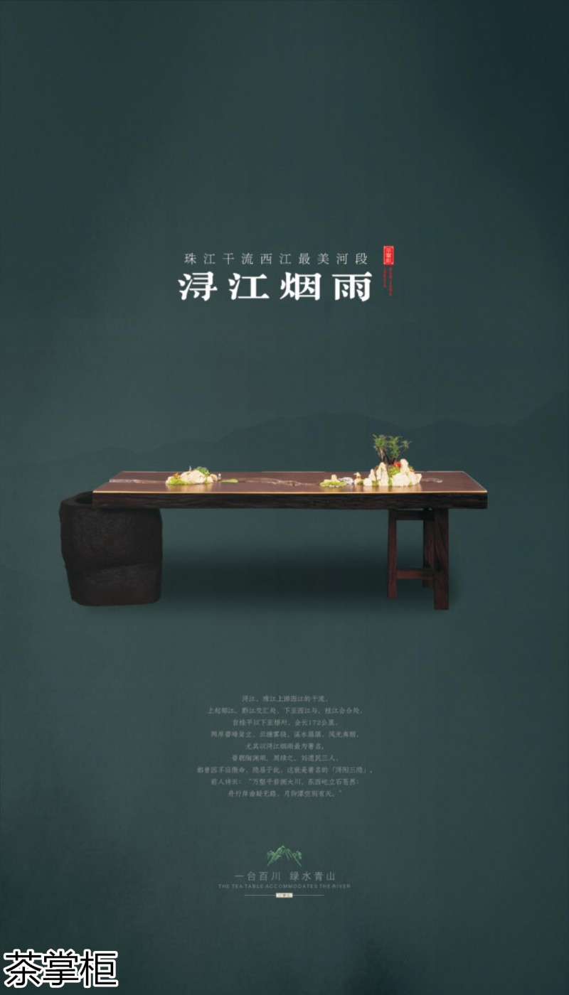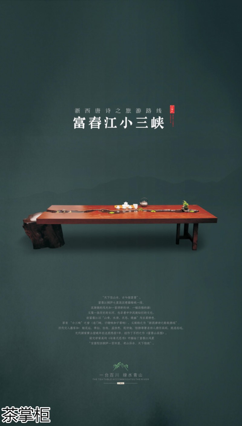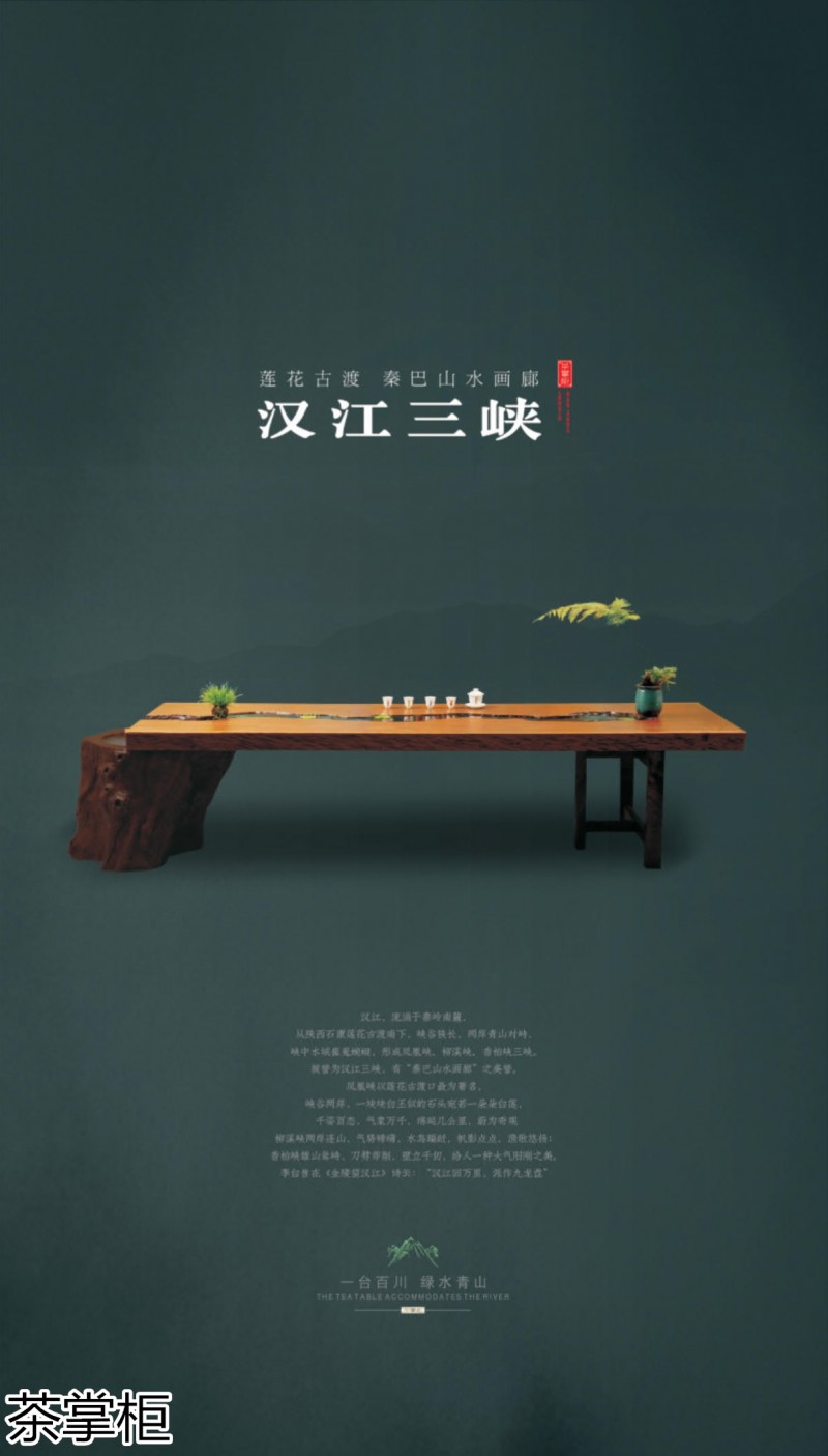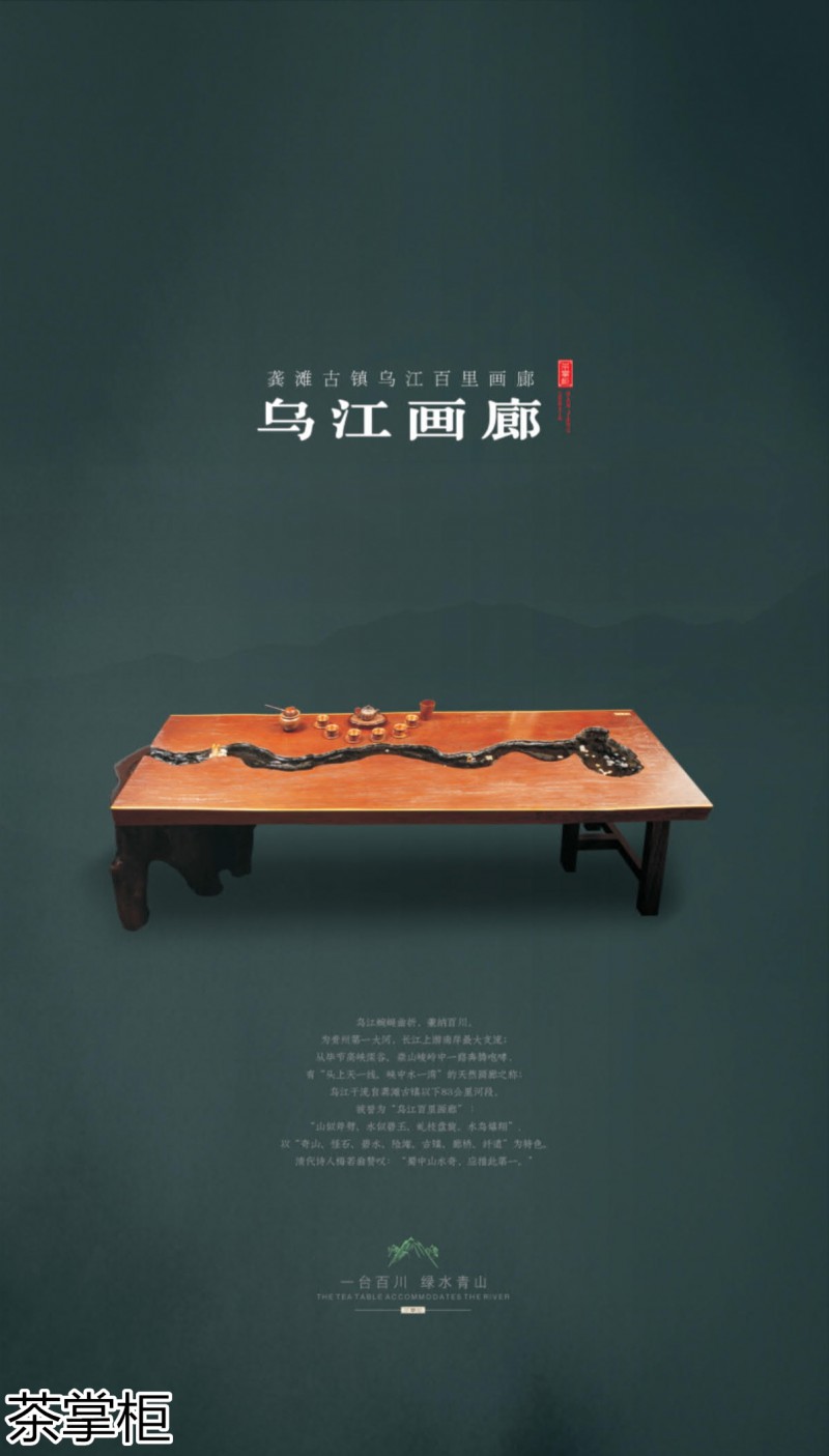 茶掌柜是鄭州唐人文化傳播有限公司旗下的茶空間品牌,公司以“綠水青山就是金山銀山”為創(chuàng)始指導(dǎo)思想,采用高分子碳纖維復(fù)合材料取代傳統(tǒng)的不可再生的木材,利用先進(jìn)的航空測繪技術(shù),萃取大美河流中經(jīng)典的河段,匠心雕琢,一次成型,完美呈現(xiàn)古樹名木的自然紋理,每一款都經(jīng)過工藝美術(shù)大師精心設(shè)計(jì)與雕琢,再由造景師精心布置出千姿百態(tài)、栩栩如生的獨(dú)特自然景觀,真實(shí)還原了旖旎的風(fēng)光,醉人的美景,蜿蜒綿亙、云霧繚繞、流水潺潺、搖曳生姿、如詩如畫...一步一景一畫卷,移步換景畫中游...