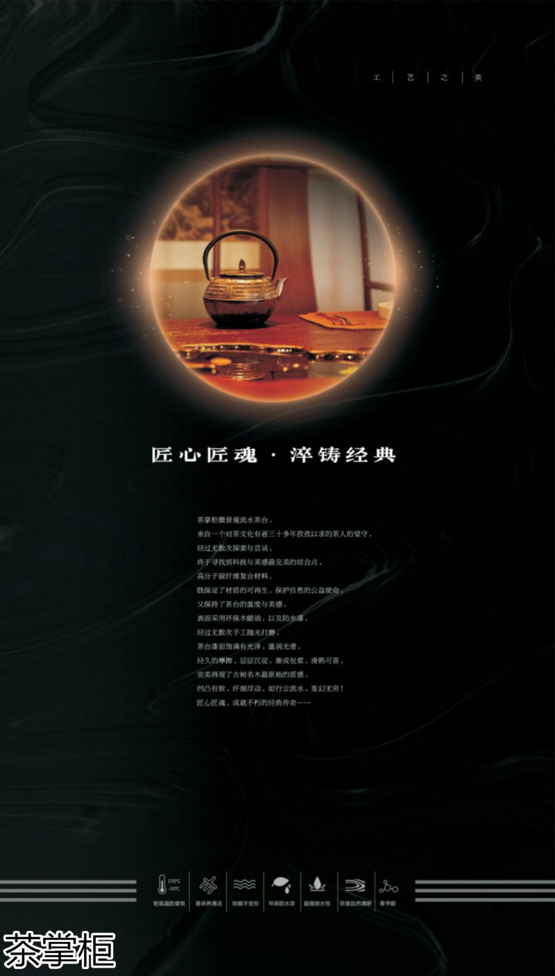 茶掌柜微景觀流水茶臺,來自一個(gè)對茶文化有著三十多年孜孜以求的茶人的堅(jiān)守,經(jīng)過無數(shù)次探索與嘗試,終于尋找到科技與美感完美的結(jié)合點(diǎn),高分子碳纖維復(fù)合材料,既保證了材質(zhì)的可再生,保護(hù)自然的公益使命,又保持了茶臺的溫度與美感,表面采用環(huán)保木蠟油,以及防水漆,經(jīng)過無數(shù)次手工拋光打磨。茶臺漆面飽滿有光澤,溫潤光滑,經(jīng)久的摩擦,層層沉淀,完美再現(xiàn)了古樹名木原始的質(zhì)感。凹凸有致,纖細(xì)浮動,如行云流水,變幻無窮!匠心匠魂,成就不巧的經(jīng)典傳奇......