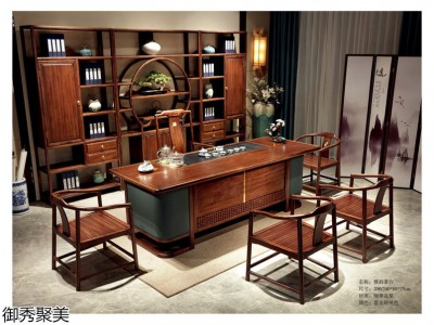 現代新中式茶空間,南康剛果花梨木、印尼金花梨木茶臺、辦公桌、班臺、書柜、博古架,江西新中式古典實木茶臺,御秀聚美家具品牌生產廠家