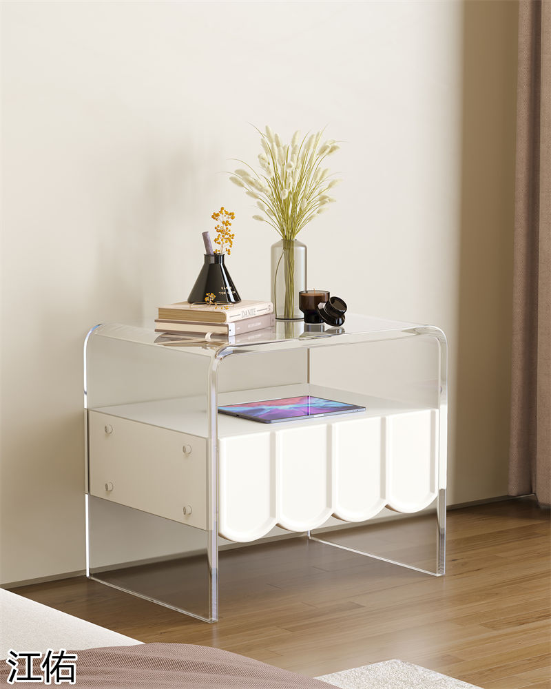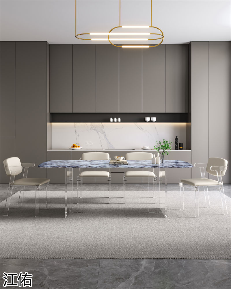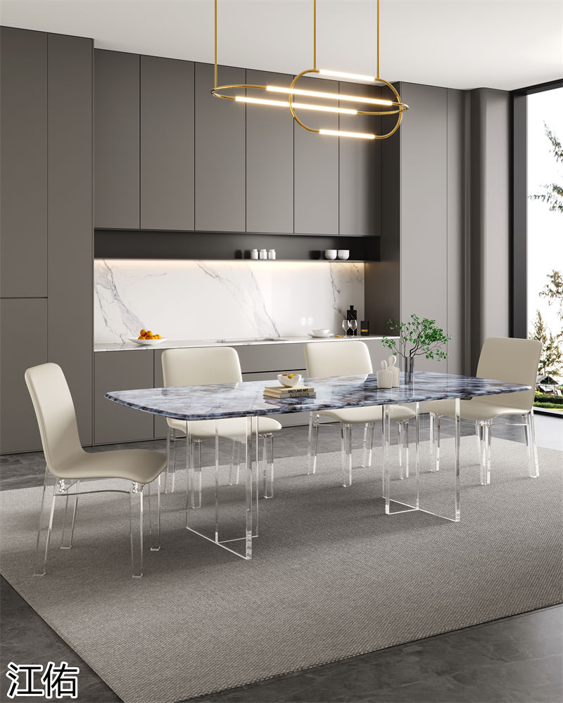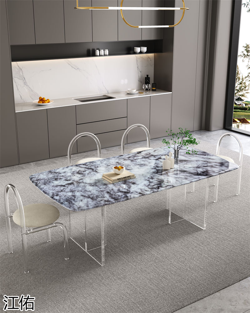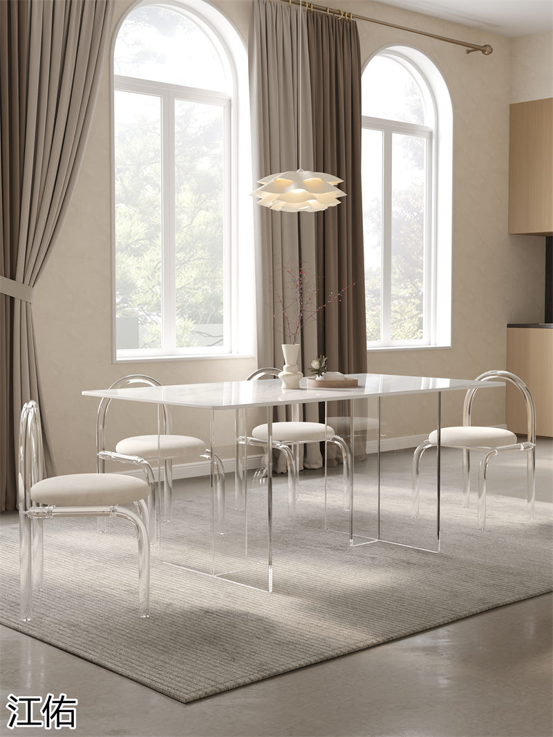 網(wǎng)紅設(shè)計師家具,南康亞克力家具,透明懸浮現(xiàn)代創(chuàng)意家具,奶油風亞克力巖板茶幾、椅子、妝臺、床頭柜、超晶石餐桌,江西江佑家具生產(chǎn)廠家