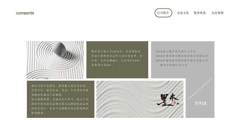 2015成立墨本家具設計工作室;2018注冊深圳市墨本家具設計有限公司;2019注冊深圳市墨本家具設計有限公司贛州市南康區分公司