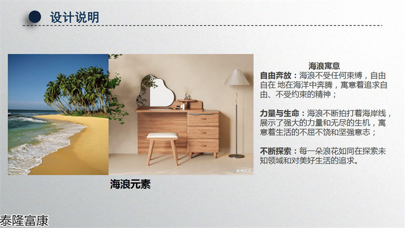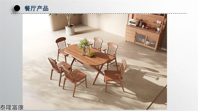 泰隆富康家具對每件產品生產都是以符合人體工程學特點為生產理念,以設計的整體創意與美感為先,以高質量、高品位的原材料制作為基礎,精心制作,層層質檢,現代化管理。產品選用質量上乘的進口實木材料,采用尖端科技,著力體現木質本身自然唯美的典雅和細膩的原始紋路,天然成趣,線條舒展、流暢、新穎大方、別具一格,生活氣息濃郁,風格古樸大方,釋放出自然和力量,給都市人營造一種夢想中的鄉村田園......
