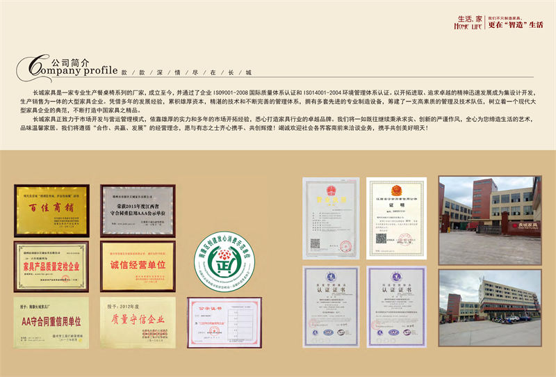 長城家具是一家專業生產餐桌椅系列的廠家,成立至今,并通過了企業IS09001-2008國際質量體系認證和IS014001-2004環境境管理體系認證。以開拓進取、追求卓越的精神迅速發展成為集設計開發,生產銷售為一體的大型家具企業。憑借多年的發展經驗,累積雄厚資本,精湛的技術和不斷完善的管理體系,擁有多套先進的專業制造設備,籌建了一支高素質的管理及技術隊伍,樹立著一個現代大型家具企業的典范,不斷打造中國家具之精品。