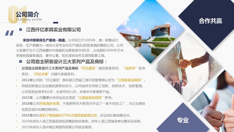 公司自主研發(fā)設(shè)計三大系列產(chǎn)品及商標(biāo)“仟億通寶”酒店家具系列、“仙夢坊”軟體系列、“仟億沐香”白蠟?zāi)炯揖呦盗小?/p>
