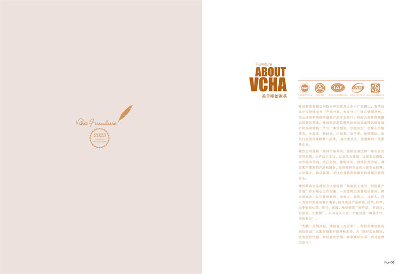 唯恰家具有限公司位于中國家具之鄉一廣東佛山,秉承沃高企業管理成員“產銷分離、專業分工”核心管理思想,師出沃高家具接待洽談產品專業部門,經由沃高家具順德公司更名而來。唯恰家具定位現代休閑治談桌椅的研發設計和品牌營銷,嚴守“本分踏實、價值共生”的核心價值理念,小品類、積跬步,小而美、致千里,勵精圖治,致力打造洽談桌椅第一品牌,成為更長久、更健康的一流家具企業。