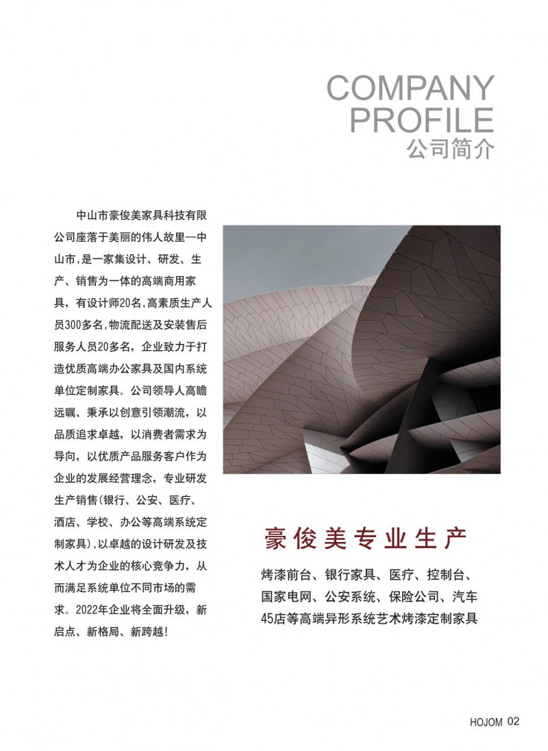 中山市豪俊美家具科技有限公司座落于美麗的——中山市,是一家集設(shè)計(jì)、研發(fā)、生產(chǎn)、銷(xiāo)售為一體的高端商用家具,有設(shè)計(jì)師20名,高素質(zhì)生產(chǎn)人員300多名,物流配送及安裝售后服務(wù)人員20多名,企業(yè)致力于打造優(yōu)質(zhì)高端辦公家具及國(guó)內(nèi)系統(tǒng)單位定制家具。公司領(lǐng)導(dǎo)人高瞻遠(yuǎn)矚、秉承以創(chuàng)意引領(lǐng)潮流,以品質(zhì)追求卓越,以消費(fèi)者需求為導(dǎo)向,以?xún)?yōu)質(zhì)產(chǎn)品服務(wù)客戶作為企業(yè)的發(fā)展經(jīng)營(yíng)理念,專(zhuān)業(yè)研發(fā)生產(chǎn)銷(xiāo)售(銀行、公安、醫(yī)療、酒店、學(xué)校、辦公等高端系統(tǒng)定制家具),以卓越的設(shè)計(jì)研發(fā)及技術(shù)人才為企業(yè)的核心競(jìng)爭(zhēng)力,從而滿足系統(tǒng)單位不同市場(chǎng)的需求。2022年企業(yè)將全面升級(jí),新啟點(diǎn)、新格局、新跨越!