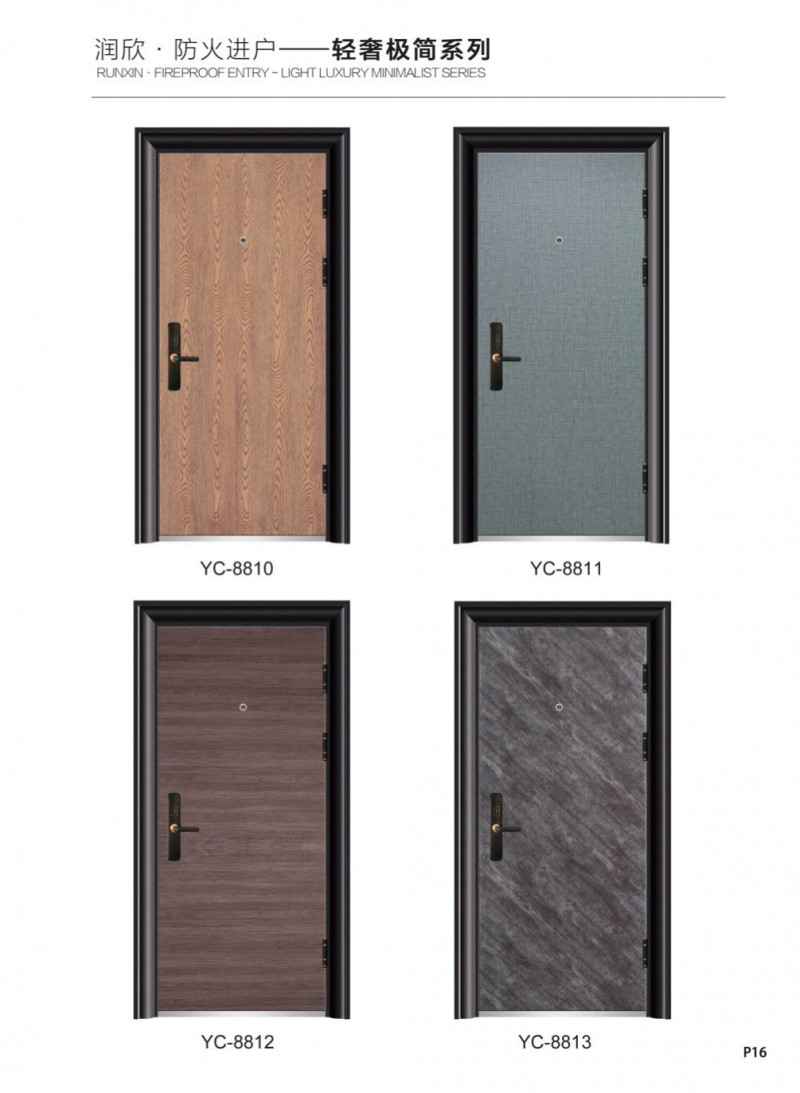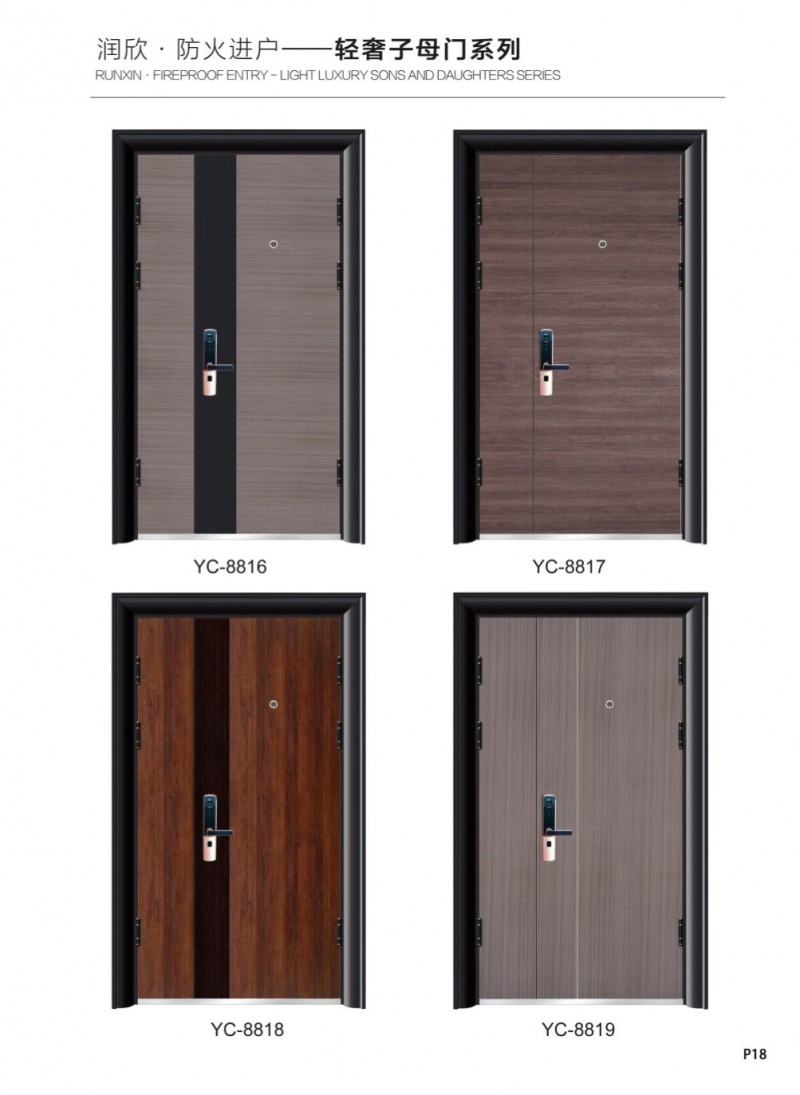 公司產品有:防火入戶門(輕奢一條線系列、 輕奢極簡系列、高端門系列)、防火入戶子母門(輕奢子母門系列、高端子母門系列)、防火門、防火窗、學校門、防火門配件等。