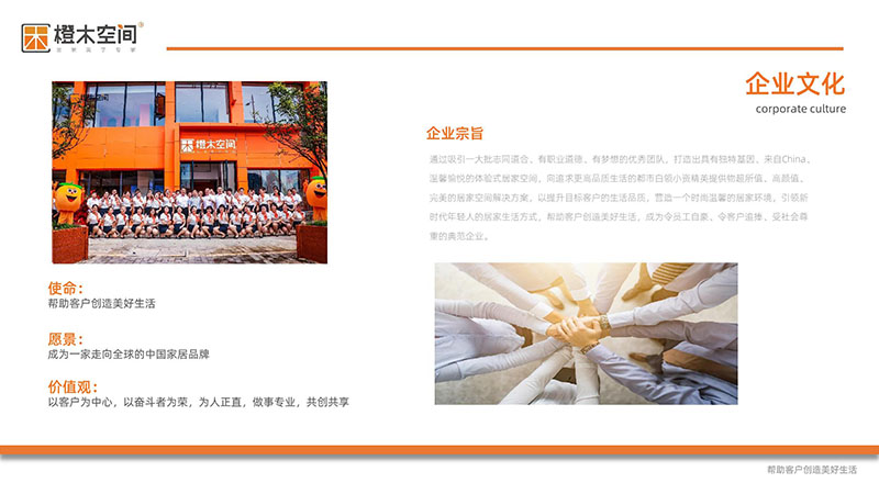 通過吸引一大批志同道合、有職業道德、有夢想的優秀團隊,打造出具有獨特基因、來自China、溫馨愉悅的體驗式居家空間,向追求更高品質生活的都市白領小資精英提供物超所值、高顏值、完美的居家空間解決方案,以提升目標客戶的生活品質,營造一個時尚溫馨的居家環境,引領新時代年輕人的居家生活方式,幫助客戶創造美好生活,成為令員工自豪、令客戶追捧、受社會尊重的典范企業。