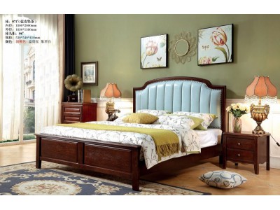 木佰創美式家具:胡桃色美式壓紋床071#(藍皮豎條)