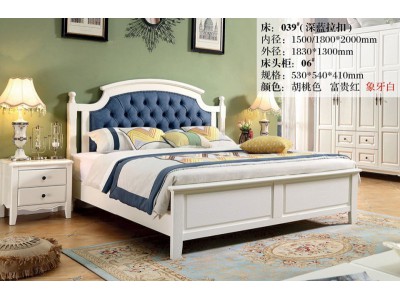 木佰創美式家具:象牙白美式壓紋床039#(深藍拉扣)