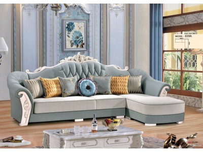 659A 是一款七字型,經典藍白配清新優雅,橡木外架鏤空雕花描淡金工藝(也可改描銀)(也可以做高級灰外架),三位外架有2.4米長鏤空雕花有兩個心形很浪漫溫馨,架子布采用科技布面料,耐磨耐用透氣性好,靠包布是提花面料點綴更精致優雅,坐包免洗布面料,易打理,坐包內采用38-45密度高彈海棉配小直徑獨立彈簧(經過高溫處理)相結合,海綿多彈簧少,坐感起到軟硬適中的舒適感,使用更長久耐用,高度三位1.305米,妃位長1.9米,總長度3.3米,可加減10公分內尺寸,做的全拆裝,內結構四面拋光烘干處理,起到防潮防霉作用,這款沙發還有個特點扶手外架比較寬大和其它款式風格不一樣,扶手高度也更高,可午休半躺半靠看?!都很不錯,用的腳寬厚大結實體現更穩重大氣。