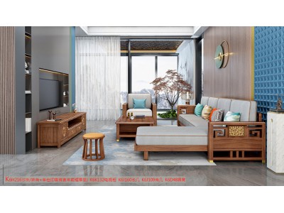 康優寶輕奢新中式胡桃木家具:K6H216沙發 轉角+單位(D靠背直條前框厚墊)