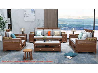 康優寶輕奢新中式胡桃木家具:K6H91沙發 1+2+3位(A靠背欄桿前框薄墊)
