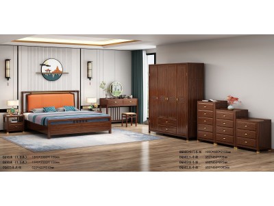 衛(wèi)府里新中式家具:床C610、床頭柜CG603、四門衣柜BG605、斗柜DG602