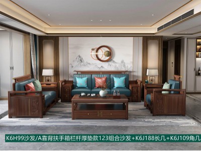 康優寶輕奢新中式胡桃木家具:K6H99沙發/A靠背扶手箱欄桿厚墊款123組合沙發+K6J188長幾+K6J109角幾